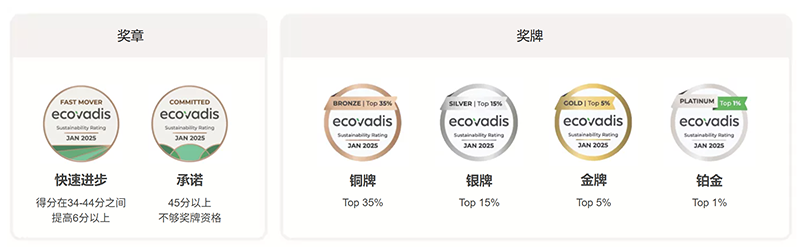 EcoVadis发布的新评分标准在2024年已正式执行。现在,EcoVads的奖牌将根据百分位数阈值颁发,而不是根据分数确定奖牌级别。奖牌的授予是基于被评估公司的百分位排名,该排名在记分卡发布时计算。它将公司的分数与EcoVadis数据库中过去12个月的所有评级公司进行比较。