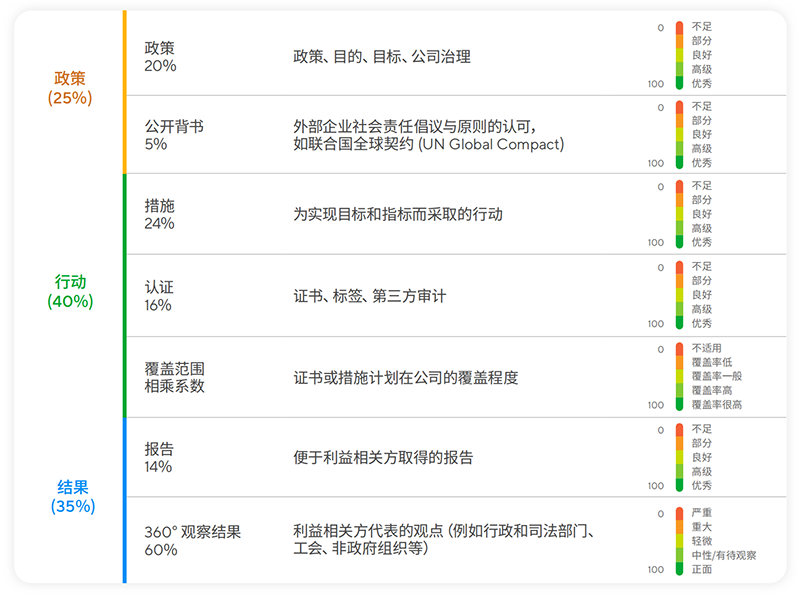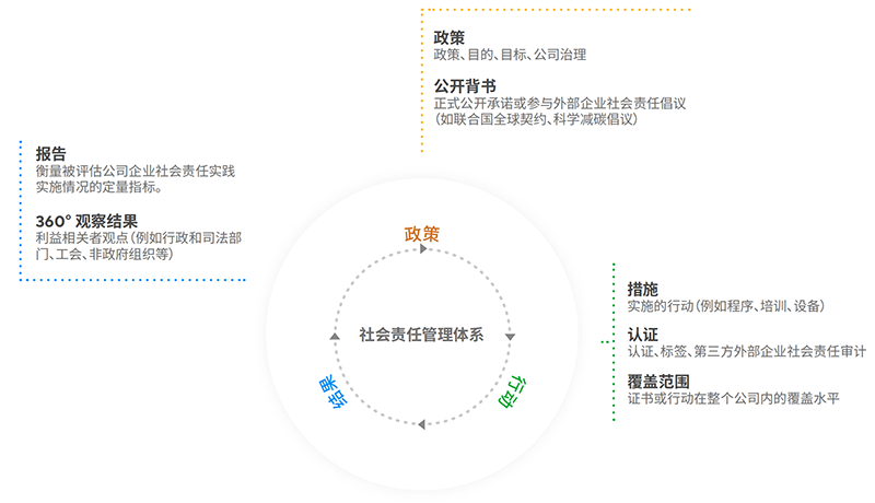 EcoVadis 认为一个有效的企业社会责任管理体系由3个层面组成:政策、行动与结果。这些核心管理层面又进一步分为7个管理指标:政策、公开背书、措施、认证覆盖范围、绩效反馈和 360°观察结果。