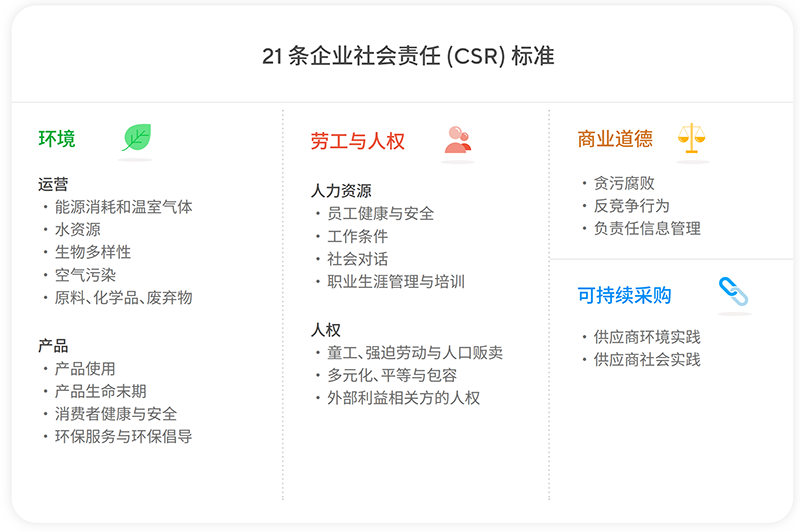 EcoVadis评级会借助多达21条企业社会责任标准来评估企业在“环境、劳工与人权、商业道德和可持续采购”4大主题中的表现。每项评估所涵盖的标准均基于企业社会责任风险与公司所处行业、企业规模和运营地点之间的相关性。