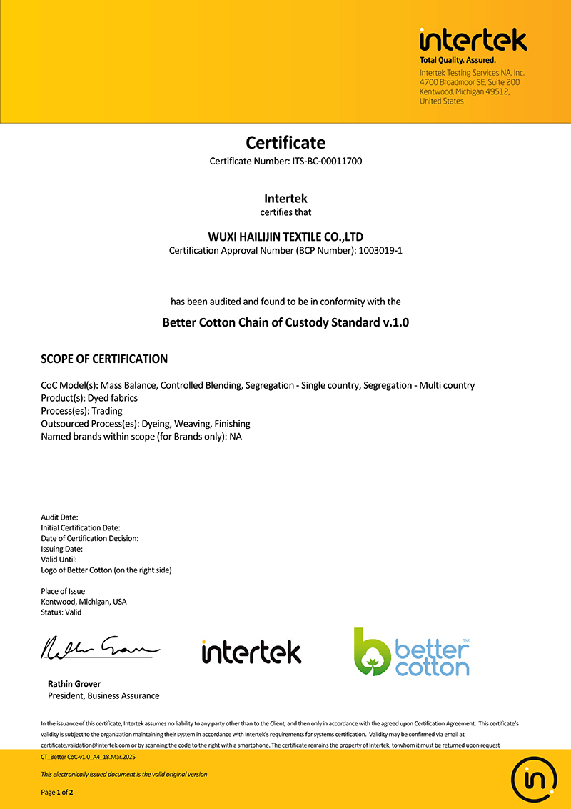 证书有效期:BCI认证证书有效期为12个月。企业可在证书到期前三个月申请续期一年,以确保整个纺织链产品的持续性安全和顺畅衔接。