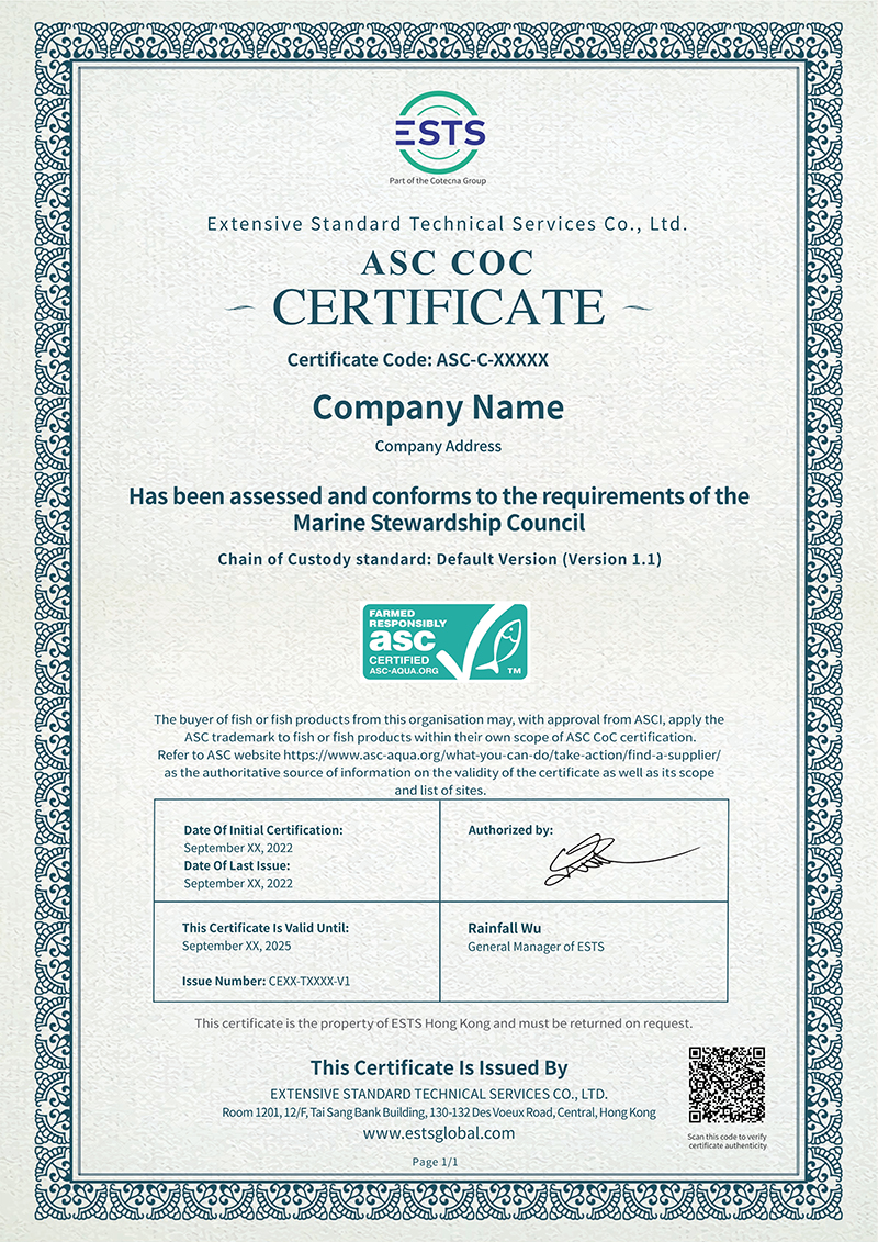 ASC 产销监管链认证:自2012年初以来,ASC一直采用MSC产销监管链认证进行ASC认证产品的供应链审核,MSC产销监管链体系在海产品隔离和可追溯方面具有国际领先的地位,且能覆盖从养殖场到最终销售的整个供应链。
