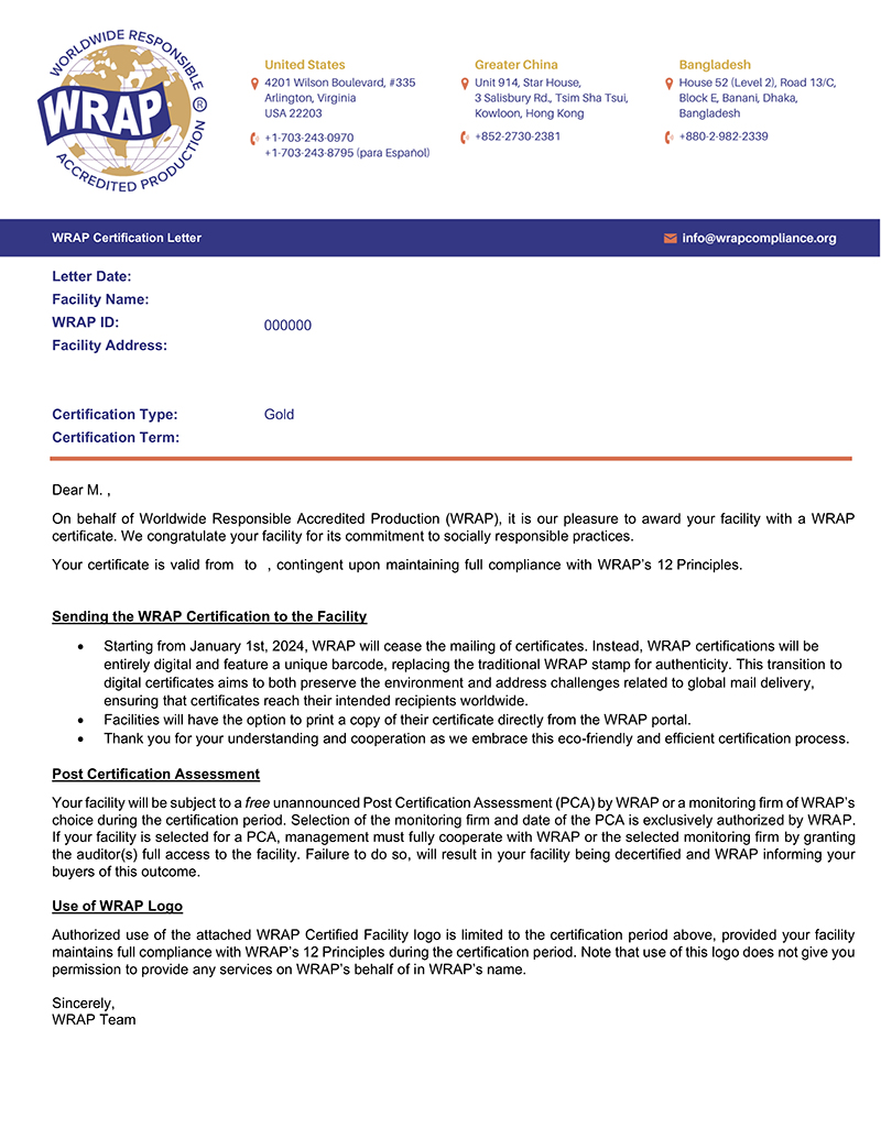 自2026年3月1日起,通过WRAP验厂后,获得的证书将不再区分等级,证书上将不再显示等级,只显示证书有效期;如验厂不通过,则不予发放证书。