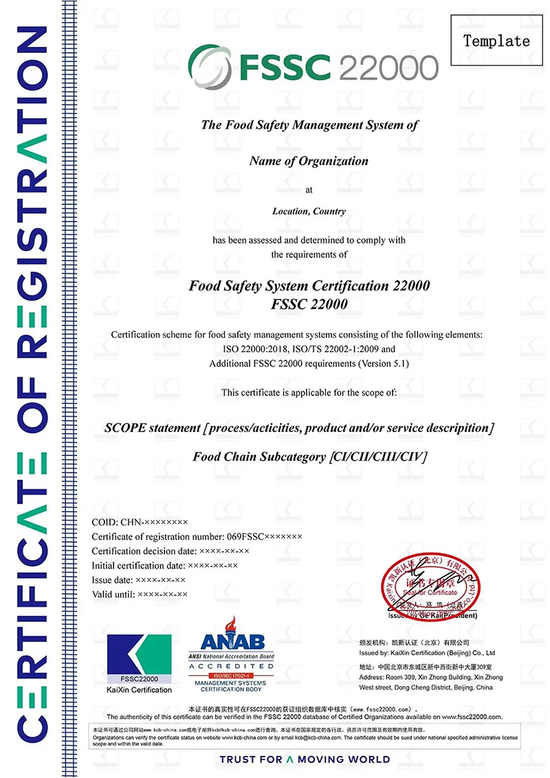 FSSC 22000是由荷兰食品安全认证基金会管理的国际食品安全管理体系认证,整合了ISO 22000标准、行业前提方案(PRP)技术规范和附加要求,适用于食品制造、包装、运输及零售等供应链环节。该认证获全球食品安全倡议组织(GFSI)认可,并得到欧盟食品及饮料产业联盟支持,被视作进入国际市场的通行证。